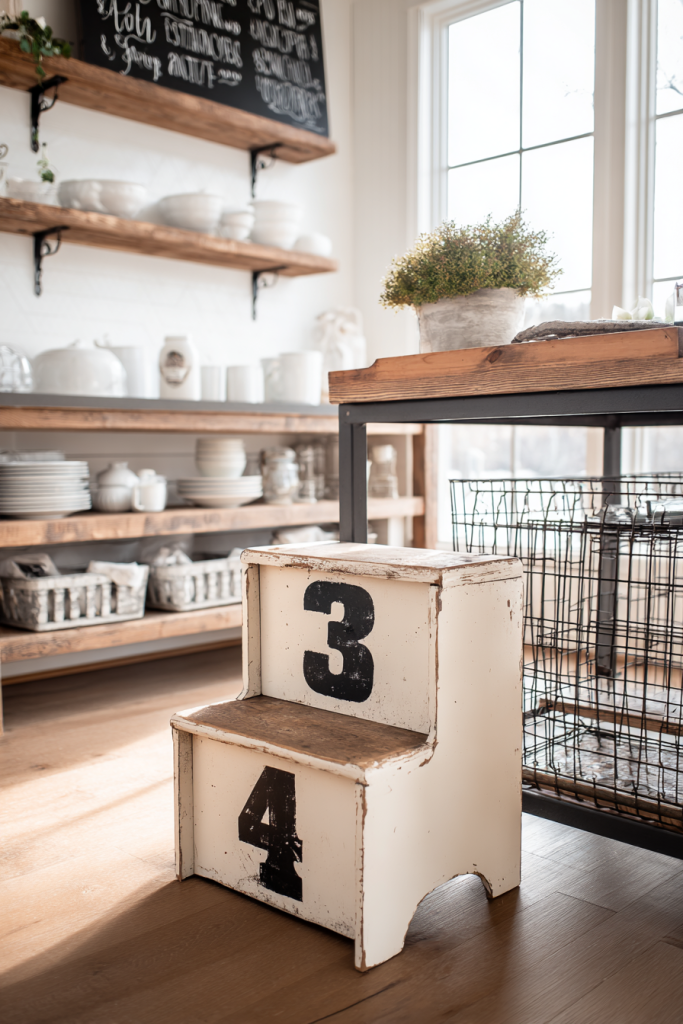 Adding vintage numbers or lettering gives your step stool that collected, antique feel. I especially love this for farmhouse or industrial styles.