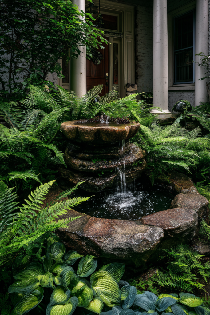 Installing a water feature near your entrance creates instant ambiance with the soothing sound of flowing water. I added a bubbling fountain two years ago, and it’s amazing how it drowns out street noise while adding a sense of serenity. Options range from simple bubbler rocks to elaborate tiered fountains or small ponds with aquatic plants. Position features where you’ll enjoy them most near seating areas or visible from indoor windows. Recirculating fountains require minimal water once filled and can be winterized easily in cold climates. Solar-powered options eliminate electrical work, though plug-in models offer more reliable operation. Surround water features with moisture-loving plants like ferns, hostas, or irises for a lush, integrated look.