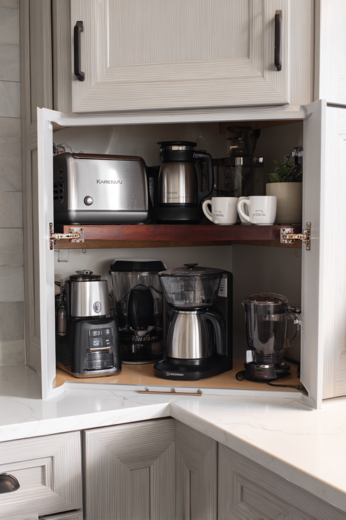 Creating an appliance garage using a cabinet with a roll-up door keeps small appliances accessible while maintaining clean counter lines. I converted a corner cabinet into an appliance storage area that hides my coffee maker, toaster, and blender when not in use.