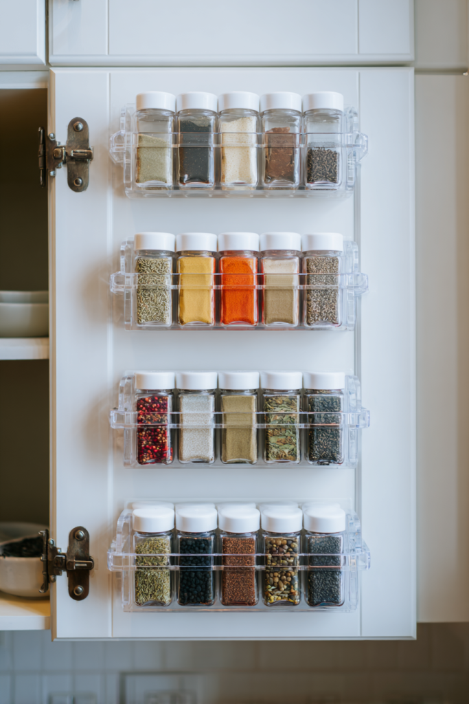 The key is choosing shelves that are shallow enough to clear your existing items when the door closes. I recommend measuring first, then selecting acrylic or wooden spice racks specifically designed for door mounting. Position them at eye level for easy access while cooking.