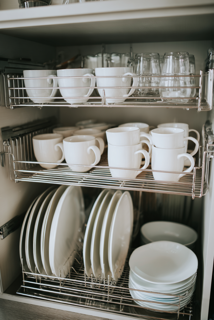 These shelves typically expand to fit different cabinet widths and create an additional tier for storage. They’re perfect for dishes, mugs, food items, and cleaning supplies. The key is choosing sturdy options that can support the weight of your items.