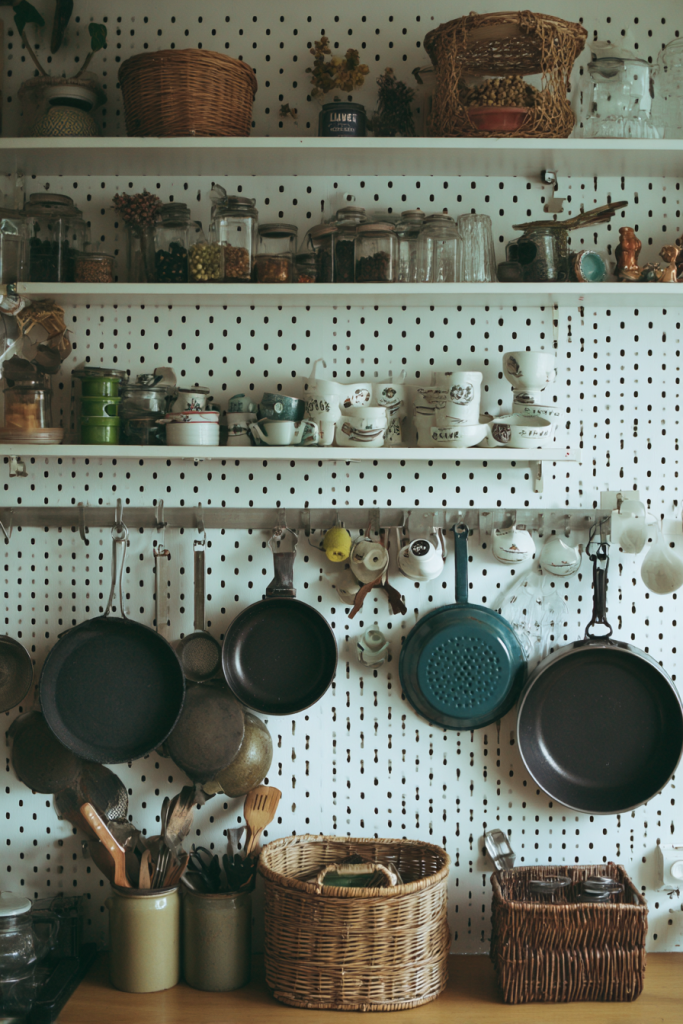 The beauty of pegboard systems lies in their adaptability. You can rearrange hooks, shelves, and baskets whenever your storage needs change. Choose accessories specifically designed for kitchen use, including utensil hooks, small baskets, and even tiny shelves for spice jars.