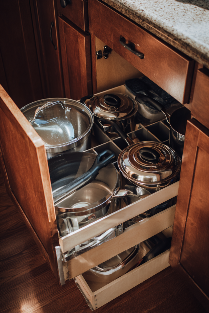 Deep lower cabinets often become black holes where items disappear forever. Installing pull-out drawer organizers transforms these spaces into easily accessible storage that maximizes every inch of depth.