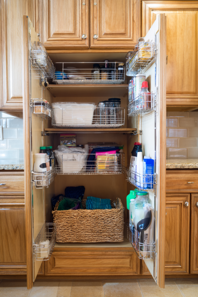 This solution works especially well for storing oils, vinegars, canned goods, or small appliances. Everything becomes visible and accessible, eliminating the frustration of items disappearing into dark corner recesses.