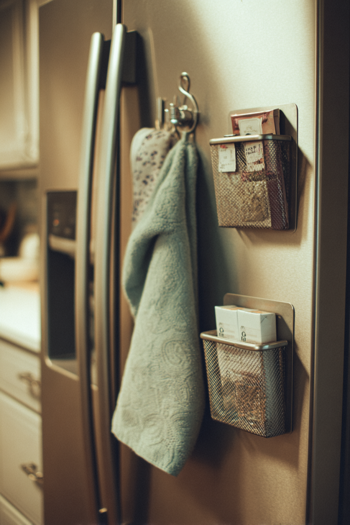 The side of your refrigerator offers valuable vertical storage space that’s often completely ignored. I use strong magnetic hooks and baskets to store lightweight items like kitchen towels, oven mitts, and cleaning cloths right where I need them most.